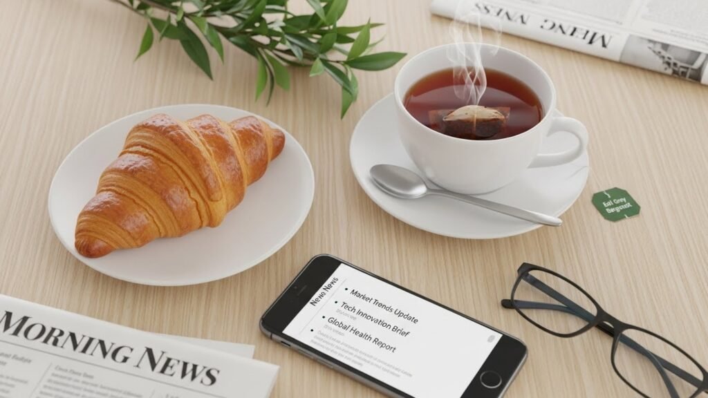IMAGE DESCRIPTION (TEXT ONLY): A top-down view of a modern breakfast setting with a croissant, a cup of tea, and a smartphone displaying a list of bulleted news points, suggesting a healthy morning information routine.